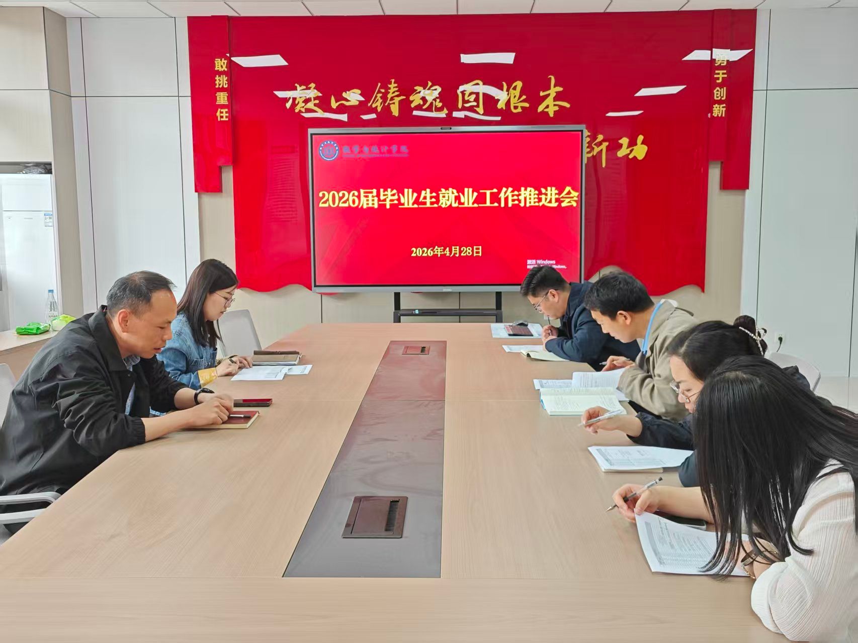 会上,刘姗详细汇报了截至目前2026届毕业生的整体就业进展,包括签约、升学、考公考编、西部计划、参军入伍等各类状态的数据统计,并重点介绍了在就业指导、信息推送、重点群体帮扶等方面已开展的工作及下一步计划。随后,各班主任依次发言,交流了本班学生在求职过程中出现的思想动态、具体困难与共性需求,分享了在个性化指导、家校联动、资源对接等方面的有效经验与做法。