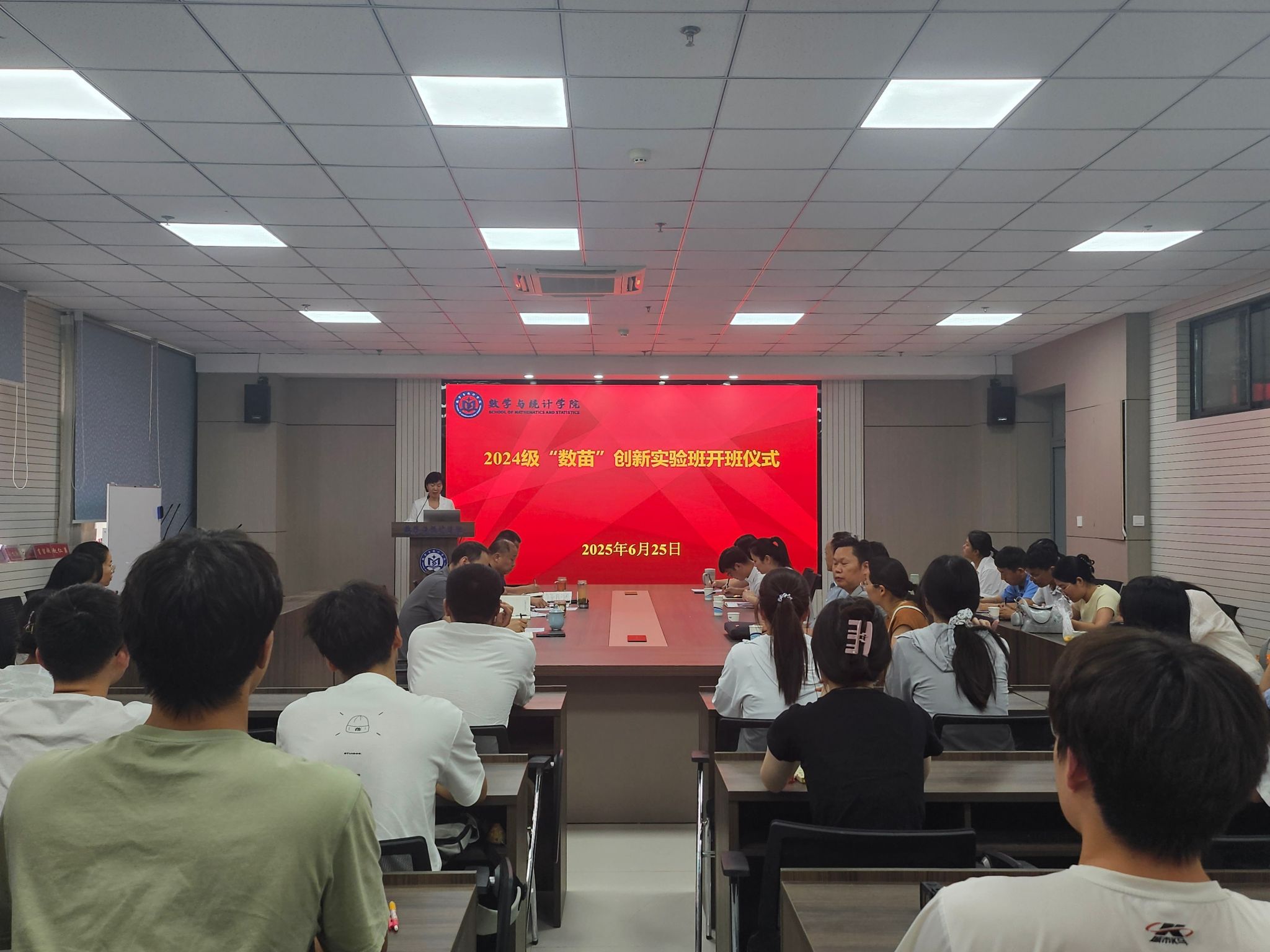 于 2025年6月25日下午在惟德楼315会议室举行2024级“数苗”创新实验班开班仪式。学院党委书记郭红彦、院长谷存昌、党委副书记程凯、副院长肖留超、实验班全体指导教师和学生参加开班仪式,仪式由肖留超主持。