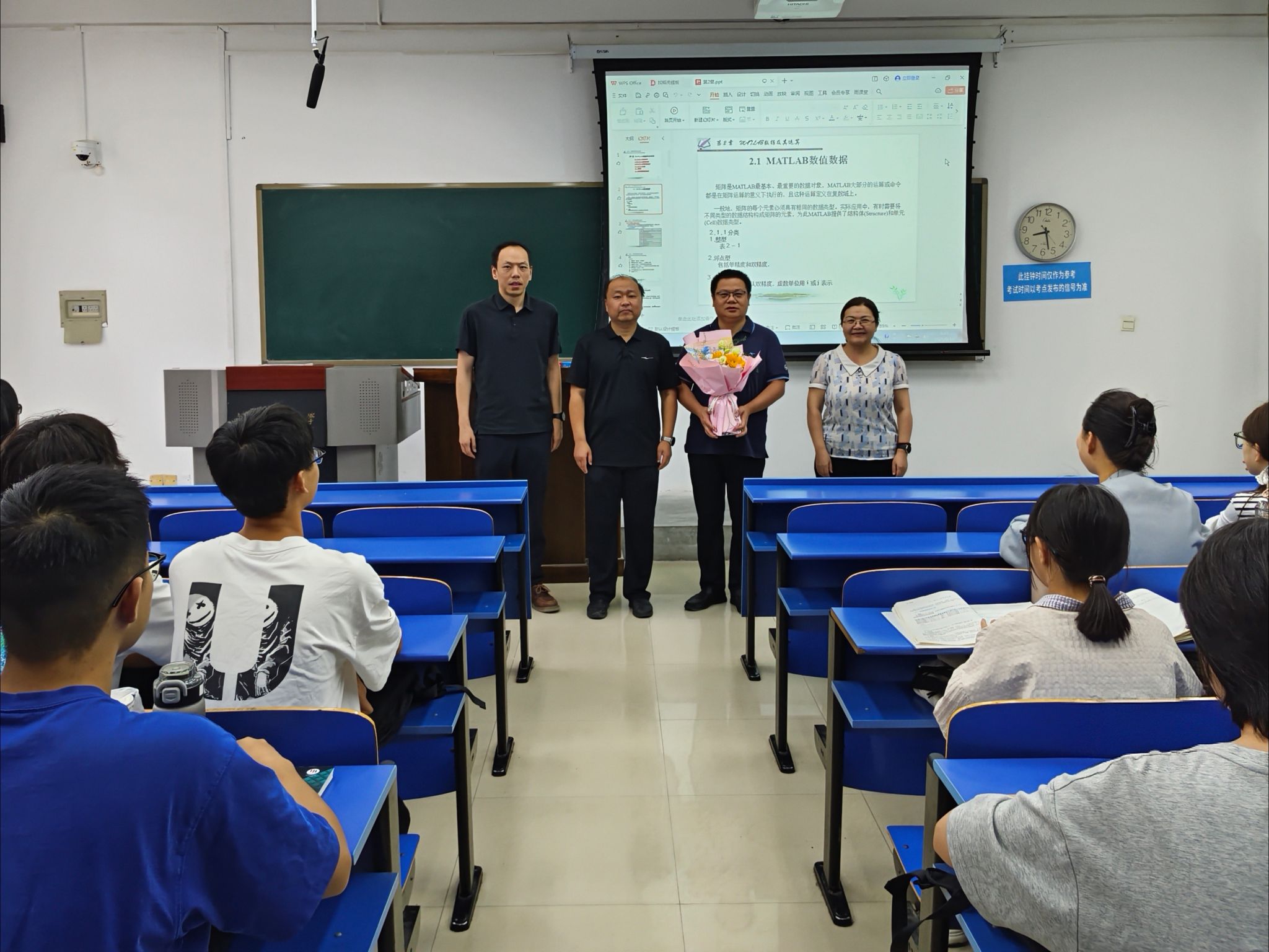 9月10日上午,院长谷存昌、党委副书记程凯、副院长曹建莉带领学院党政办、教学办负责人,走进课堂,亲切看望慰问奋战在教学一线的任课教师。上课前,学院领导为肖留超、李小旺、陈晓友、王佳佳4位教师送上鲜花,代表学院向他们及全体教师致以节日的诚挚问候与美好祝福。