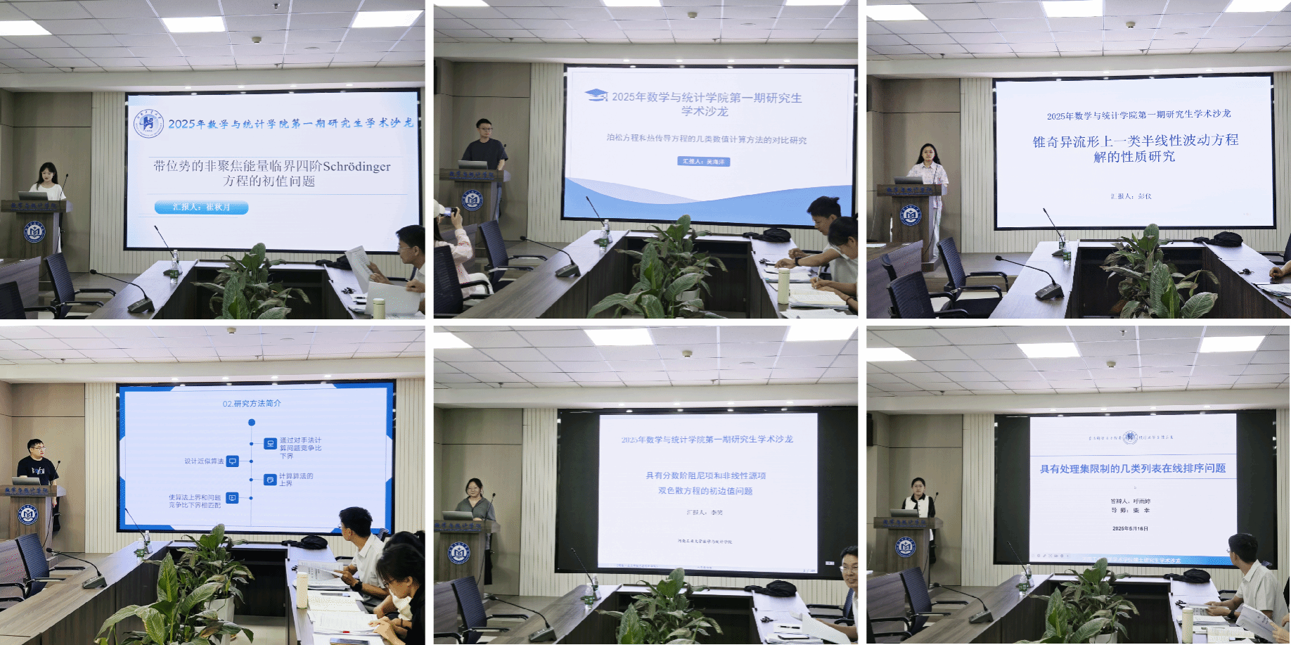 本期学术沙龙由2022级数学专业研究生王新鹏、彭仪、吴海洋、李笑、崔秋月和呼雨婷分享科研成果,沙龙涵盖多个研究方向,汇报内容兼具理论深度与应用价值。王新鹏同学以“具有处理集限制的若干时间在线排序问题”为题,探讨了复杂任务调度中的优化策略;彭仪同学围绕“维奇异流形上一类半线性波动方程解的性质研究”,深入分析了微分方程的理论性质;吴海洋同学则通过“泊松方程和热传导方程的几类数值计算方法的对比研究”,系统分析了不同数值方法的适用场景。李笑、崔秋月和呼雨婷三位同学分别就“具有分数阶阻尼项和非线性源项双色散方程的初边值问题”、“带位势的非聚焦能量临界四阶Schrödinger方程的初值问题”以及“具有处理集限制的几类列表在线排序问题”为题,分享了各自在模型构建、理论证明和算法设计中的研究成果。