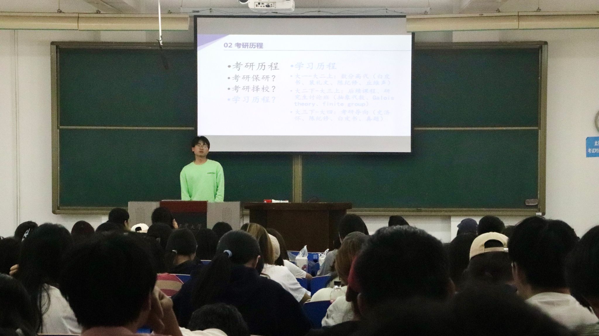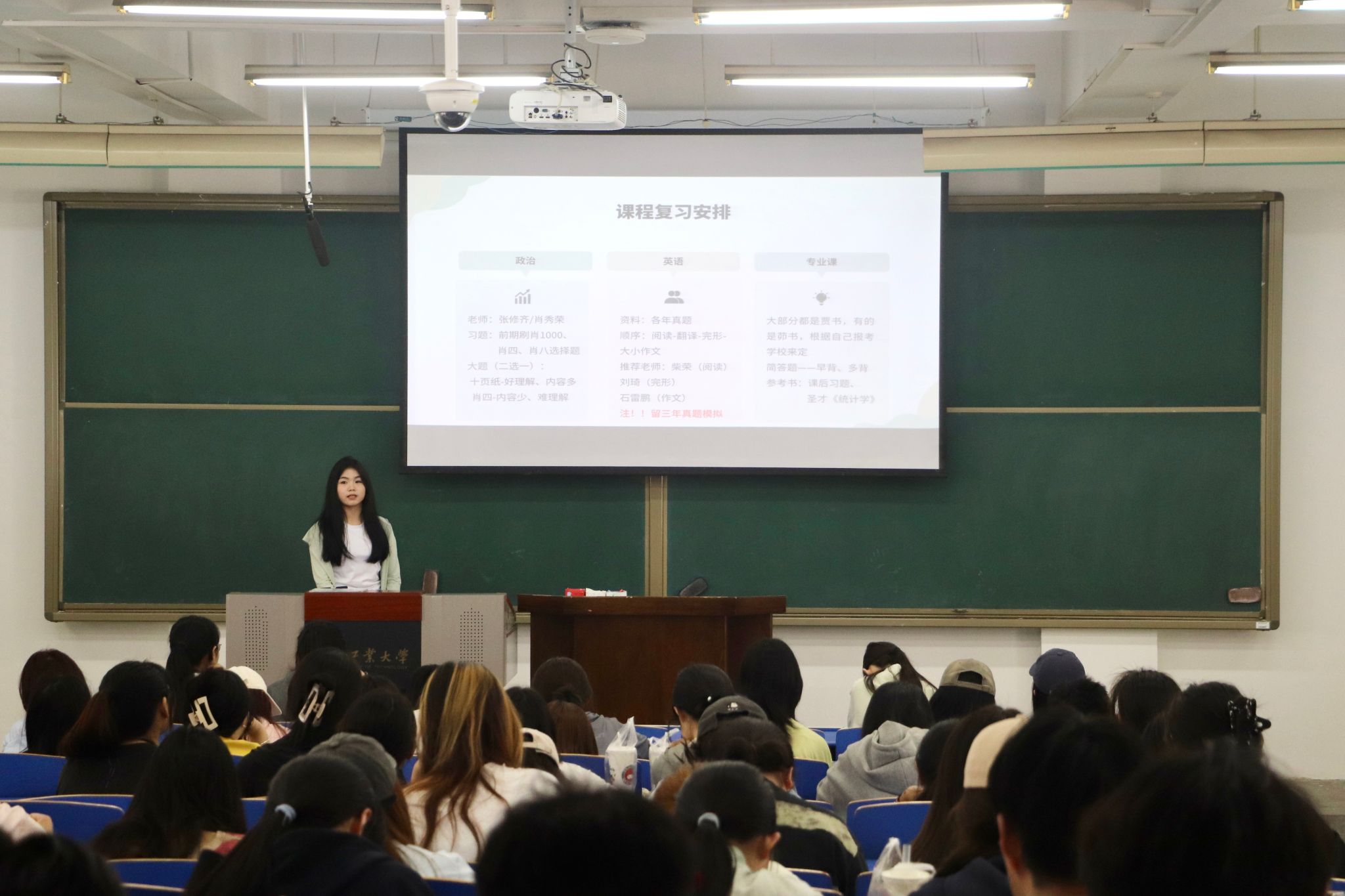 在分享环节,成功推免至东北大学的胡佳丽同学结合自身经历,向同学们介绍了高效的学习方法、与推免相关的重要时间节点、初试准备与复试准备等内容。她鼓励大家提前联系导师,积极参加夏令营,提前熟悉科研环境。第一志愿上岸首都师范大学的孙小朋同学重点从复习时间管理、参考书目选择、备考技巧等方面进行了分享。他强调一定要根据自身情况和兴趣进行院校专业的选择,并且在选择跨专业时要进行多方面考量。调剂上岸河北工程大学的李悠然同学从院校选择、复习规划、学习方法、心态调整等方面进行了详细分享。她告诉同学们“不盲目复制别人的规律,找到适合自己的办法全力以赴”。成功考上公务员的陈以萱同学从公务员招考信息的获取、考试内容的范围、备考的方法、考试形式以及面试经验等多个方面进行交流分享。她建议大家要以历年国家公务员考试为风向标,充分利用国家新闻官方网站,学习其新颖全面、逻辑清晰的论证过程和行文技巧,并保持对于时事政治的敏感度,提升自己的政治素养。