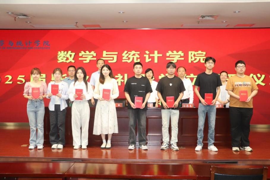 关于表彰2025届优秀考研学生的决定》。学院领导为受表彰的毕业生颁发了荣誉证书并合影留念。