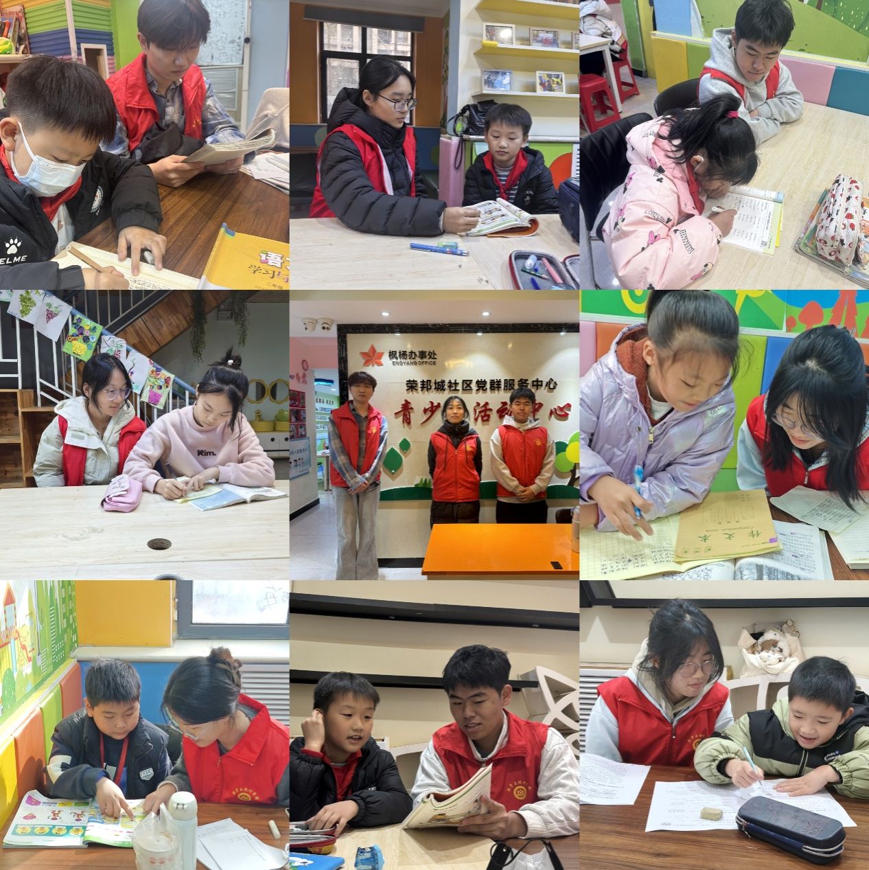 “统护新芽”服务聚焦社区儿童课后成长刚需,在荣邦社区青少年活动中心有序推进。学院志愿服务队精心选拔一批学业扎实、富有爱心的志愿者,他们身穿红色马甲,坐在孩子身边,耐心讲解数学公式、梳理语文知识点,遇到孩子们理解困难的题目,志愿者们便会用生动的例子拆解难题,让原本枯燥的题目变得有趣。特别是对于数学方面的困惑,志愿者们讲解题目的同时,更注重传授学习方法,引导孩子们举一反三,培养逻辑思维能力。