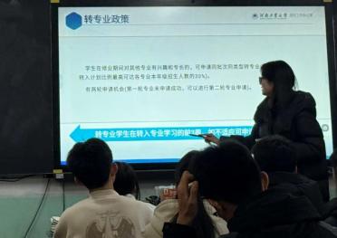 与此同时,高三五班的分享现场气氛热烈而有序。刘依萌同学没有采用传统的 PPT 念读形式,而是以“大学版升级指南”为框架,系统且生动地讲解了大学 阶段的多项关键政策。她围绕学校基本情况、转专业、资助政策、辅修学士学 位与微专业展开分享,不仅详细解读了河南工业大学的基本情况和国家奖学金、助学金等资助体系,还清晰梳理了转专业的相关问题,以及辅修微专业的 培养路径与发展价值。让台下同学对大学学业规划有了更清晰的认知,有效缓 解了大家对未来的迷茫感,也为同学们提前规划大学生活提供了切实的参考。