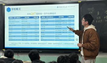 757 组的朱彦全同学的宣讲从一帧帧校园风景开始——莲湖倒映的图书馆、梧 桐树下的林荫大道、操场上飞扬的社团旗帜…这些鲜活的画面,让河南工业大 学不再是遥远的校名,而是触手可及的青春图景。朱彦全同学从学校历史沿革、学科建设、师资力量、科研成果等方面,详细介绍了河南工业大学作为省 属重点高校的办学优势。重点展示了我校在粮食工程、机械工程等特色领域的 领先地位,以及“厚基础、重实践、强能力 ”的人才培养模式,帮助学生明确 专业发展方向。不仅介绍了学校的学科优势,还讲了应用统计学相关发展前景 以及广泛应用价值。
