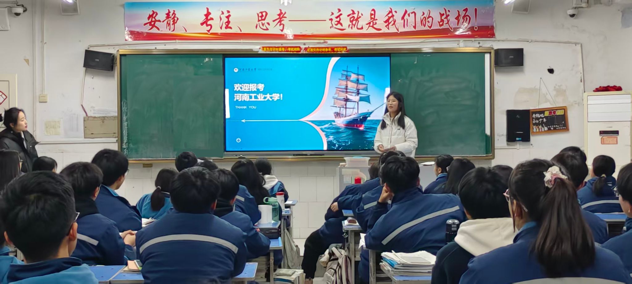以PPT为载体,千佳萌同学从学校概况出发,向学子们介绍了河南工业大学的特色专业,雄厚的师资力量,突出的学术成果,多姿多彩校园环境等方面,台下学子们不由得向往起来,现场宣讲的氛围得到了充分的调动。