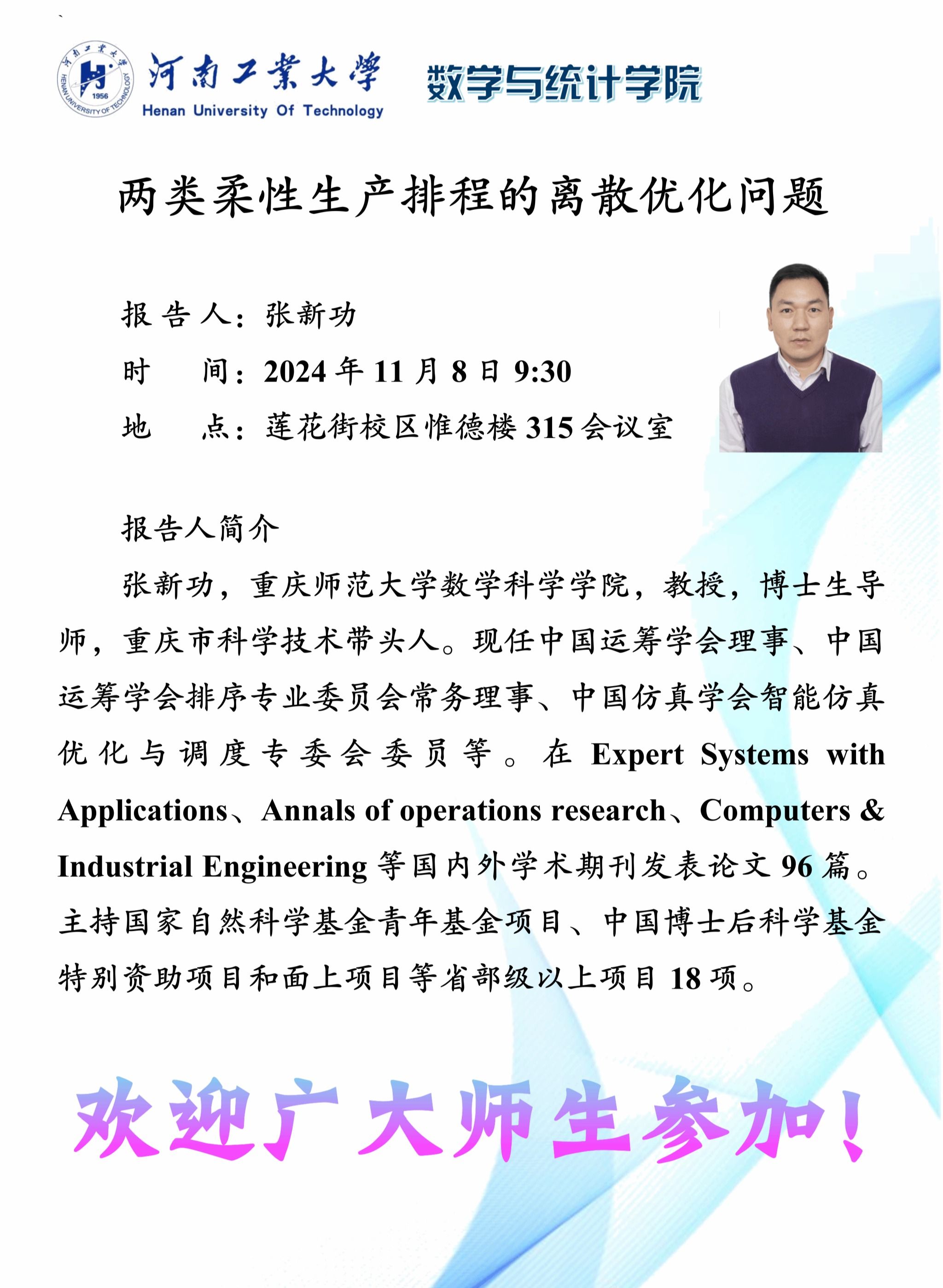 报告人简介:张新功,重庆师范大学数学科学学院,教授,博士后,博士生导师,重庆市科学技术带头人。2013年获得上海市优秀博士学位论文;重庆大学经济与工商管理学院管理科学与工程专业博士后,2018年12月至2019年11月在英国华威大学商学院作高级访问学者。2016-2017年台湾逢甲大学统计系访问学者。现任中国运筹学会理事、中国运筹学会排序专业委员会常务理事、中国仿真学会智能仿真优化与调度专委会委员、重庆市运筹学会常务理事、重庆市工业与应用数学学会理事、重庆市系统工程学会理事。长期从事组合最优化、排序论、物流与供应链管理等研究。在Expert Systems with Applications、Annals of operations research、Computers & Industrial Engineering、Swarm and Evolutionary Computation、Journal of the Operations Research Society of China、系统科学与数学等国内外学术期刊发表论文96篇,其中SCI收录42篇,在科学出版社等出版学术专著2部,申请授权发明专利2项。主持国家自然科学基金青年基金项目、中国博士后科学基金特别资助项目和面上项目、重庆市自然科学基金创新发展联合基金项目、重庆市自然科学基金面上项目等省部级以上基金项目、重庆市研究生教改重点项目和重庆市首批在线开放课程等省部级以上项目18项。作为主研人员参与国家自然科学基金重大项目、科技部国家重点研发计划“数学和应用研究”重点专项、国家自然科学基金面上项目等8项。